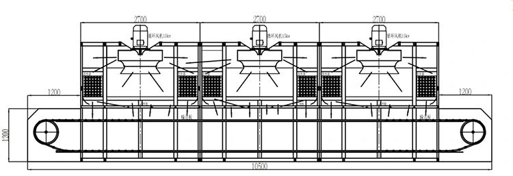 2. Keringtető ventilátor: A szárítózóna tetejére egy 15 kW-os keringető ventilátor van felszerelve, amely hatékonyabbá teszi a kamrán belüli légáramlást.